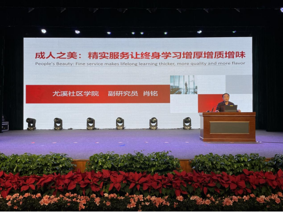 最后,福建开放大学尤溪工作站站长、副研究员肖铭在研讨会上分享了报告《成人之美:精实服务让终身学习增厚增质增味》,从县域终身教育视角出发,介绍了尤溪县精实服务出台的背景、基于问题解决的精实服务路径,并对县域终身教育进行了前瞻性展望。
