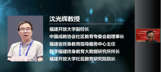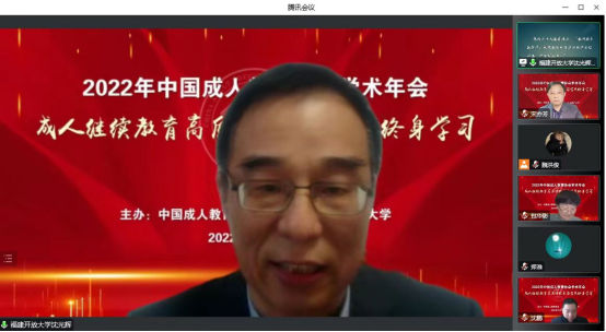 2022年12月16日,由中国成人教育协会主办、上海师范大学承办的以“成人继续教育高质量发展与全民终身学习”为主题的中国成人教育协会学术年会以线上和线下相结合的方式在上海师范大学举行。福建开放大学党委委员、副校长,数字福建终身教育大数据研究所所长沈光辉教授在线出席会议并作主题报告。
