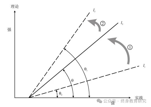 基于巴斯德象限的启发,所有的终身教育研究都可以按照理论与实践两个维度来对应描述基础研究和应用研究(图1)。θ角的“大小”表明某一学术研究中理论与实践的研究取向所占比例的大小,即所开展的研究是属于应用趋向还是理论趋向。当θ角比较小的时候,表明学术研究是以实践取向为主,理论取向较弱而应用取向较强;当θ角比较大的时候,表明学术研究中以理论研究为主要取向,其实践取向相对较弱。依据巴斯德象限分析,目前的终身教育研究多处于L1线的状态,即实践取向的应用研究为主,而随着人们对科学研究二维象限模型的理解,未来的终身教育学术研究将会逐步向L2线发展,即增大学术研究中的理论取向,加强对基本认识的边界强度。当终身教育学术研究能够实现从L2线向L3线发展的时候,那么,学术研究就真正成为一种由实践问题激发的理论研究,是应用研究与理论研究的融合,从而使终身教育学术研究从爱迪生象限迈进巴斯德象限,意味着真正实现了由应用实践问题引发的基础理论研究,那时终身教育的学术研究将对学科研究与教育科学做出更大的贡献,这正是我们所要追求的未来终身教育研究的价值取向。